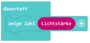 Bei den Tasten werden nur zwei Zustände bzw. Werte unterschieden: gedrückt (wahr) oder nicht gedrückt (falsch). Der Helligkeitssensor unterscheidet hingegen mehrere Helligkeitsstufen. Während wir Begriffe wie hell, sehr hell oder dunkel verwenden, drückt der Sensor die Helligkeit in Zahlen aus. Um mit dem Sensor arbeiten zu können, müssen wir also zunächst ein Gefühl dafür entwickeln, welche Bedeutung die Zahlen haben, die der Sensor liefert. Welche Zahlen würden wir dem Begriff hell und welche dem Begriff dunkel zuordnen? Es bietet sich daher an, zunächst ein kleines Programm zu schreiben, das die Werte des Sensors einfach kontinuierlich auf dem LED-Display ausgibt. Die Werte des Sensors liefert der Block Lichtstärke im Bereich Eingaben.