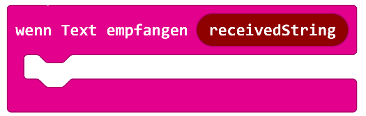 Der Lampen-Calliope ist der Empfänger. Mithilfe des Blocks wenn Text empfangen receivedString lauscht der Calliope, ob in seiner Funkgruppe Nachrichten eintreffen. Den Inhalt der Nachricht speichert er in der Variablen receivedString. Das bedeutet so viel wie empfangener Text. Den Block für die Variable receivedString kannst du einfach aus dem wenn Text empfangen-Block an eine andere Stelle im Programm ziehen, um eine Kopie des Blocks zu erhalten. Je nachdem, was in der Nachricht steht, kann der Lampen-Calliope nun reagieren. Wir prüfen, ob in der Variablen receivedString der Wert „an*"* steht. Wenn das der Fall ist, dann schalten wir die Lampe an. Verwende für den Vergleich den Block für den Vergleich von Texten. Du erkennst ihn an den Anführungszeichen in den weißen Feldern.