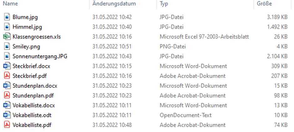 a) Abbildung 1 zeigt Beispiele für verschiedene Dateien mit ihren jeweiligen Dateigrößen. Was fällt dir auf? Du kannst die Dateien auch öffnen, um dir den Inhalt anzuschauen. Du findest sie im Ordner Dateisammlung.